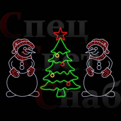 Главная » Светодиодные перетяжки » Новогоднее украшение улицы. Светодиодная перетяжка Снеговики и елка В1